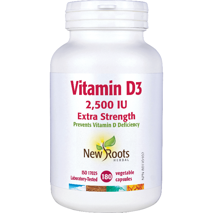The World Health Organization (WHO) recognizes vitamin D3 deficiency as a factor for many global health concerns. Statistics Canada reports that 40% of Canadians are vitamin D3 deficient in winter, and 25% during the summer months. New Roots Herbal’s Vitamin D3 Extra Strength delivers a proactive dosage of 2,500 IU per capsule to help prevent vitamin D3 deficiency year-round.