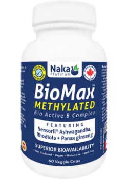 Pro BioMax Bio Active B Complex from Naka supplies bioavailable B vitamins B1, B2, B3, B5, B6, B12, and Biotin and adaptogens like Ashwagandha, Rhodiola, and Panax Ginseng to support stress adaptation, energy, and daily wellness.
